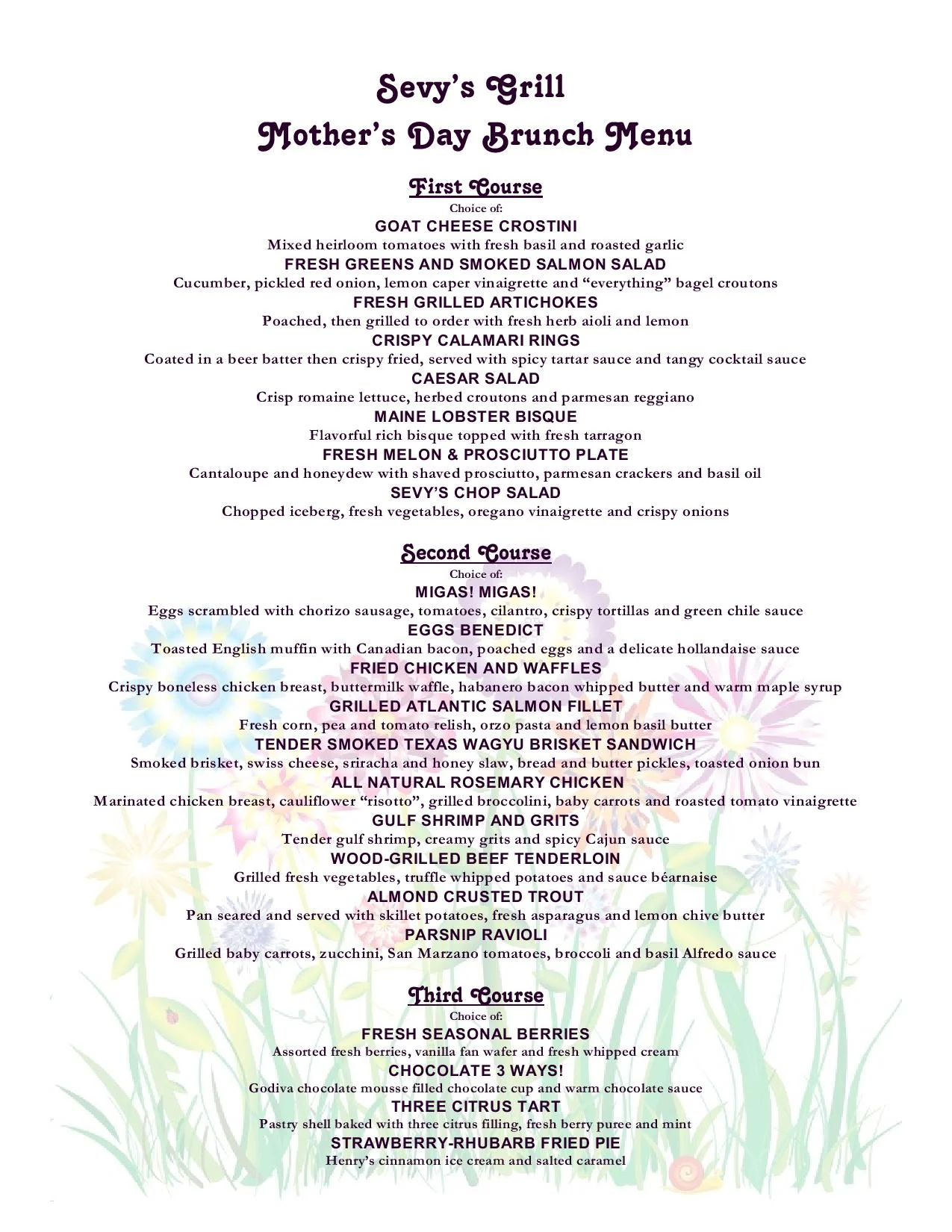 Starting with a complimentary assortment of muffins, and a featuring a tasty array of menu choices, such as Grilled Artichokes, Maine Lobster Bisque, Migas Migas, Crispy Chicken and Waffles, Beef Tenderloin, and Callebaut Chocolate! $45.95 for adults, $19.95 for children 8 and under (plus tax and gratuity), complimentary valet parking included.